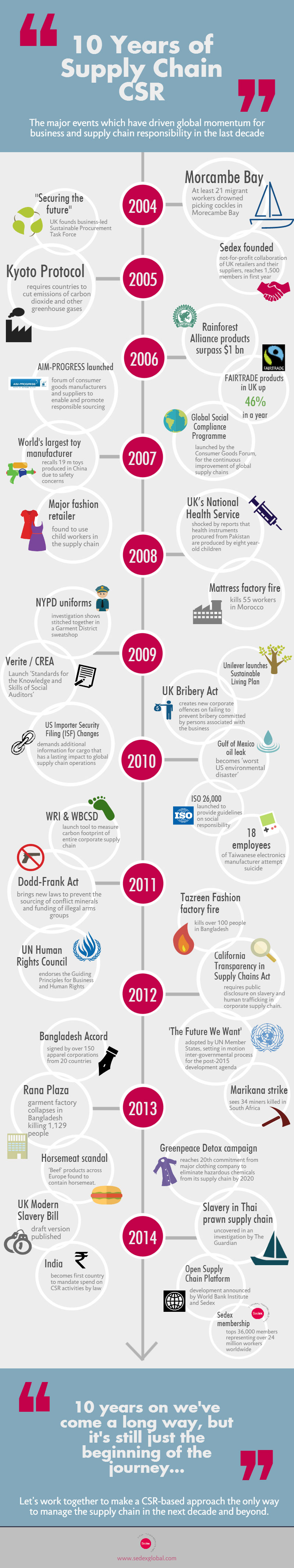 - From the Morecambe Bay tragedy in the UK in 2004 to the horsemeat scandal which rocked industry last year, the Sedex infographic puts the spotlight on the events that have driven global momentum for CSR and supply chain responsibility.