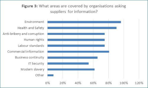 Where supplier information is being gathered, there are common topic areas of compliance focus. Environment, health and safety and commercial information (e.g. insurance certification etc.) are the top three areas covered in supplier questionnaires.