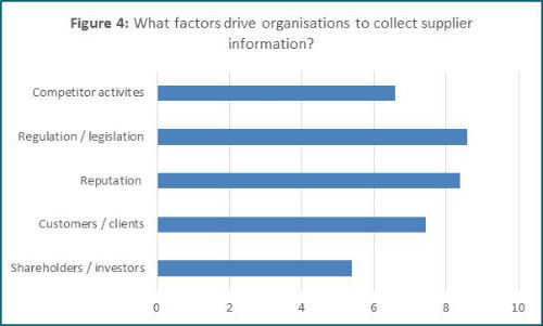 When asked which factors are driving the collection of supplier information, 43 per cent of all respondents point to regulation and legislation being the strongest motivating force, followed closely by reputational concerns (32 per cent).