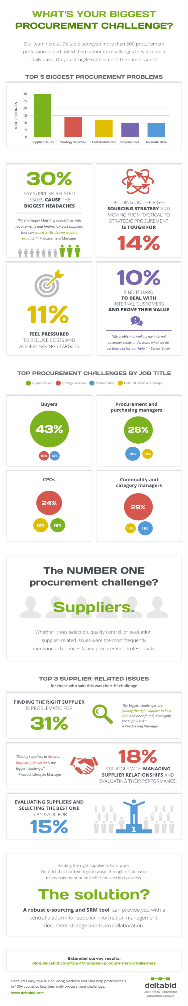 A survey of over 500 procurement professionals found that the biggest challenge was supplier-related issues, including finding and qualifying suppliers and maintaining consistent supply, with strategy selection, and cost reduction making up the top three. You can see the full results in the infographic below: