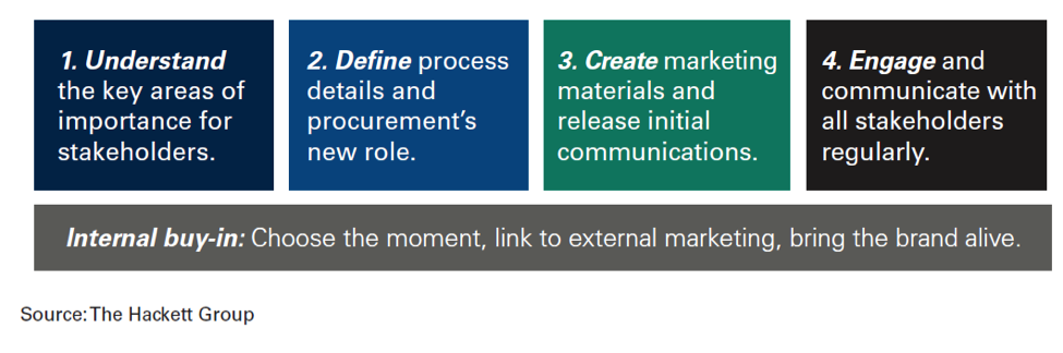 Defining a brand is an important concept for procurement because it makes their purpose and identity more comprehensible for stakeholders. The Hackett Group has outlined four major activities (understand, define, create, engage) that make up a successful brand transformation, supported by ongoing internal input. Everyone has a role to play in communicating and utilizing procurement’s new brand for effect: leadership, sourcing, buying, and operational teams.