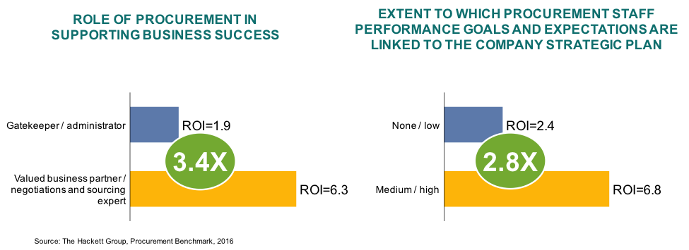 Analysis of Hackett benchmarks shows as much as a 2.5X ROI can be achieved from elevating the role of procurement, and aligning the goals and expectations of procurement teams to that of the business. That’s a hefty bump in savings or broader value terms in anyone’s language.