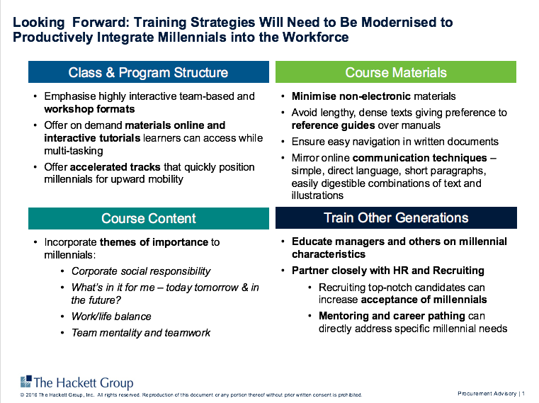 Course materials need to be user friendly, but at the same time to support multi-tasking and access to on-demand, on-line tutorial content. Course design should incorporate the themes seen as important to younger generations – how procurement connects into CSR and sustainability, work/life balance, and career advancement.